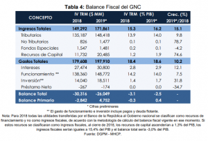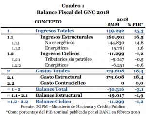 En el 2018, el Gobierno colombiano gastó el 18,4% del PIB y percibió ingresos por 15,3% del PIB. Esta relación representa un balance fiscal que se ubicó para ese año en -3,1% del PIB, consistente con un balance estructural de -1,9% del PIB (Ministerio de Hacienda, 2019). Esta información se observa de forma detallada en el siguiente cuadro:
