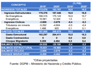 Para 2020, las estimaciones eran bastante optimistas. Se estimaba que los ingresos totales incrementarían en 0,2 puntos porcentuales del PIB frente al año 2019 “gracias a la aceleración del crecimiento económico estimado este año y al fortalecimiento institucional de la DIAN” (Presidencia de la República, 2020). Al igual que en la vigencia 2019, la meta de déficit fiscal que el Gobierno fijó para la vigencia 2020 fue inferior a la sugerida por el Comité Consultivo de la Regla Fiscal en su última reunión ordinaria. Tal y como se muestra en el siguiente cuadro, el nivel de déficit fiscal proyectado para 2020, según el documento del Marco Fiscal de Mediano Plazo, fue de 2,2% del PIB.